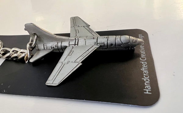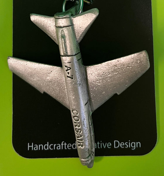Llavero de peltre con forma de avión LTV A-7 Corsair de Ling-Temco-Vought de aproximadamente 5" de largo. Detalle clásico de peltre del avión. Anilla tradicional para llavero para sujetarlo de forma segura a cualquier llave, cartera, bolso, etc.
