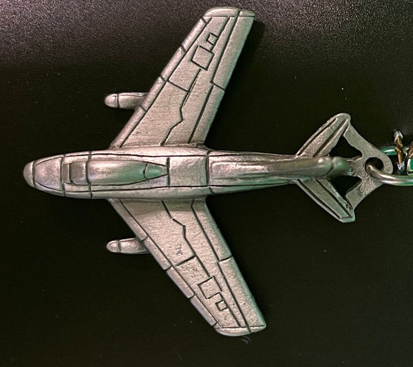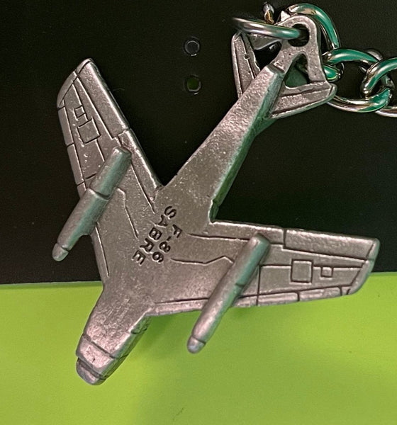 Llavero de peltre con forma de avión North American F-86 Sabre. Mide 4 1/2 pulgadas de largo (incluido el llavero y la cadena).