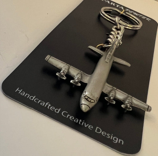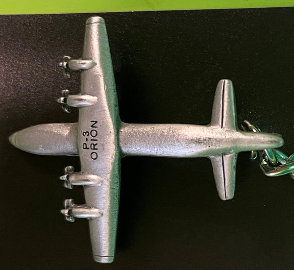 Llavero de peltre de aproximadamente 5" de largo con forma de avión Lockheed P-3 Orion. Detalle clásico de peltre de la aeronave. Anilla tradicional para llavero que se sujeta de forma segura a cualquier llave, cartera, bolso, etc.