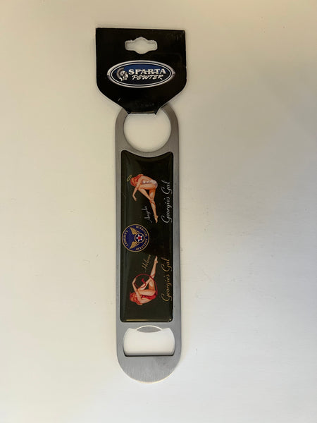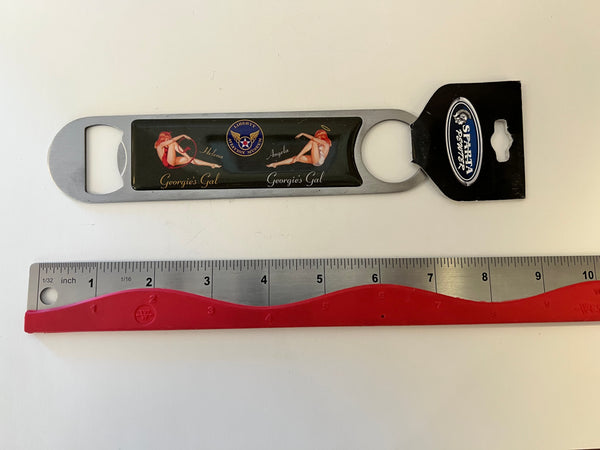 El abridor de botellas con el diseño del morro del B-25 "Georgie's Gal" del Liberty Aviation Museum mide aproximadamente 7,5" de largo y aproximadamente 1,5" de ancho. Presenta el diseño del morro del B-25 Mitchell más el logotipo de nuestro museo. Diseño de un solo lado.
