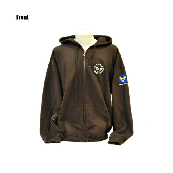 Sudadera con capucha Gildan 100 % algodón de peso pesado con el diseño de la nariz de Georgie's Gal en la espalda, el logotipo del Liberty Aviation Museum en el frente y el histórico emblema de las Fuerzas Aéreas del Ejército en la manga izquierda.