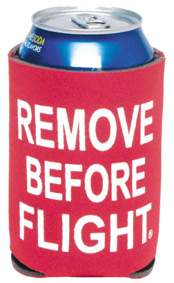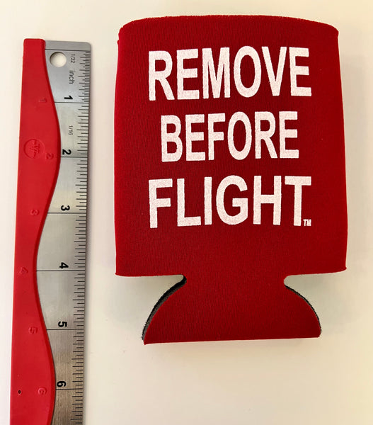 Funda para latas de neopreno roja con letras blancas. Diseño de un solo lado. Cuando está plana, mide aproximadamente 5,5" de largo y puede contener una lata de tamaño estándar de 12 oz.