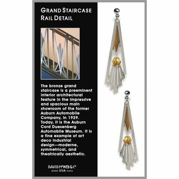 La gran escalera de bronce es una característica arquitectónica destacada del interior de la impresionante y espaciosa sala de exposiciones principal de la antigua Auburn Automobile Company, en 1929. Hoy, es el Museo del Automóvil Auburn Cord Duesenberg ubicado en Auburn, Indiana. Es un excelente ejemplo de diseño industrial Art Decó, moderno, simétrico y de estética teatral. Acabado de los pendientes: latón macizo, galvanizado con acabado plateado que no se empaña, esmaltado a mano, cuentas de vidrio, los postes son hipoalergénicos. Dimensiones: los pendientes miden aproximadamente 2" (caja de regalo con tarjeta de procedencia).