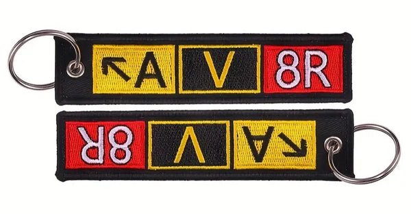 Cada llavero tiene letras bordadas en relieve en ambos lados de un material rígido, duradero y con borde de merrow. Viene con un anillo de acero grande para sujetar fácilmente todo tipo de llaves y mide aproximadamente 6 pulgadas de largo x 1 pulgada de ancho (incluido el llavero). Fondo negro con detalles en dorado/amarillo y rojo. Letras en negro, dorado/amarillo y blanco.