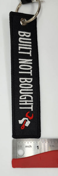 Llavero bordado de doble cara. El llavero mide 5" de largo por 1" de ancho con un anillo de llavero tradicional para sujetarlo de forma segura a cualquier llave, cartera, bolso, etc. Fondo negro con letras blancas.