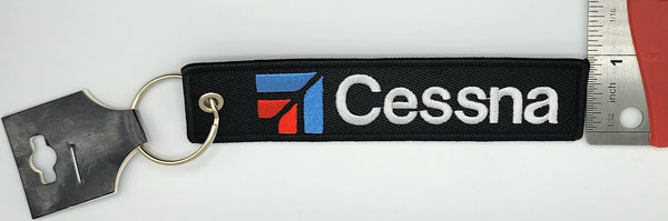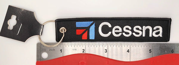 Este llavero bordado presenta el logotipo de Cessna en letras blancas con fondo negro, bordado en ambos lados de un material rígido, duradero y con borde de merrow, y viene con un anillo de acero grande para sujetar fácilmente todo tipo de llaves. Mide 5" x 1.5" (sin incluir la longitud del llavero). Fondo con letras y logotipo en blanco y negro en ambos lados.
