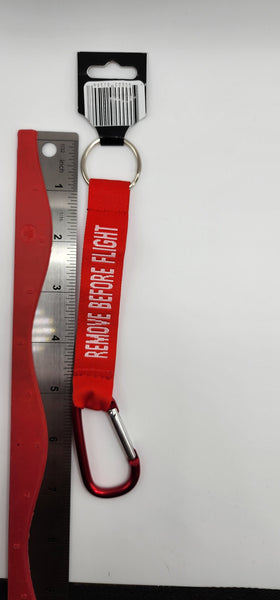 . Llavero de tela elástica suave Remove Before Flight. Aproximadamente 7 pulgadas de largo, incluido el llavero y el mosquetón. Mosquetón no apto para escalar.