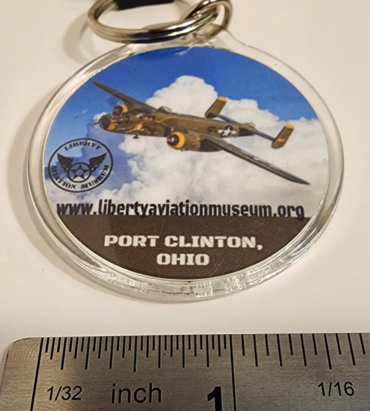 Llavero acrílico redondo con diseño de la nariz del B-25 "Georgie's Gal" Angela (The Angel) de 2" de diámetro, con un anillo de llavero tradicional para sujetarlo de forma segura a cualquier llave, cartera, bolsa, etc. Doble cara con diseño de la nariz del B-25 "Georgie's Gal" Angela (The Angel) en un lado y la imagen del avión B-25 "Georgie's Gal" con el lado izquierdo (lado de babor) del avión "Angela" (The Angel) visible, con el logotipo del museo, el sitio web y la ubicación en el otro. Mide 3" pulgadas incluido el llavero.