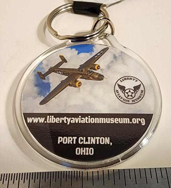 Llavero acrílico redondo con diseño de la nariz del B-25 "Georgie's Gal" Helena (el Diablo), de 2" de diámetro, con un anillo de llavero tradicional para sujetarlo de forma segura a cualquier llave, cartera, bolsa, etc. Doble cara con diseño de la nariz del B-25 "Georgie's Gal" Helena (el Diablo) en un lado y la imagen del avión B-25 "Georgie's Gal" con "Helena" en el lado derecho (lado de estribor) del avión visible con el logotipo del museo, el sitio web y la ubicación en el otro lado. Mide 3" pulgadas incluido el llavero.