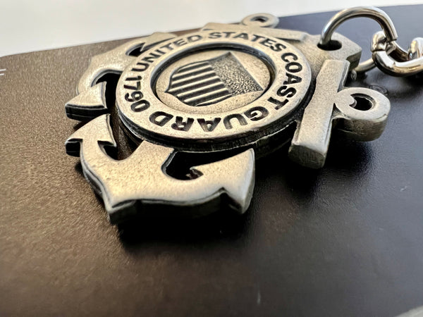 Llavero de peltre con el escudo de la Guardia Costera de los Estados Unidos que mide aproximadamente 5" de largo. Detalle clásico de peltre en un solo lado del escudo de la Guardia Costera de los Estados Unidos. Anilla tradicional para llavero para sujetarlo de forma segura a cualquier llave, cartera, bolso, etc.