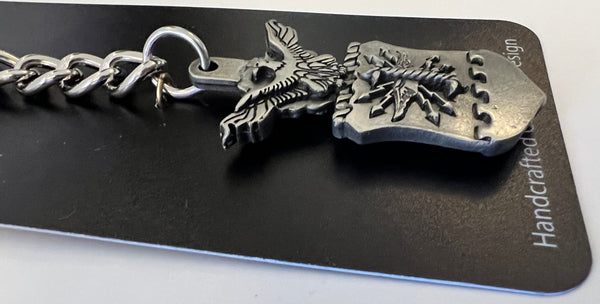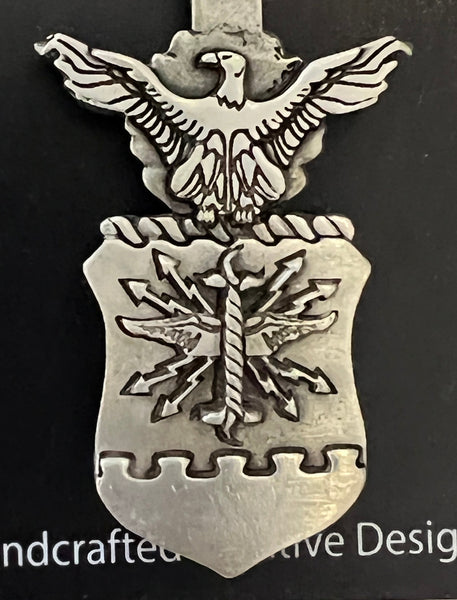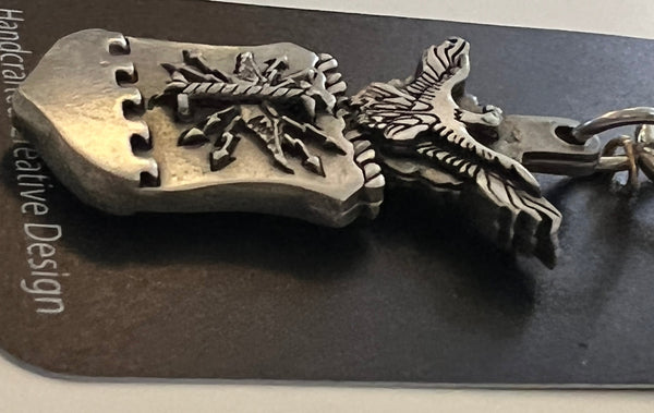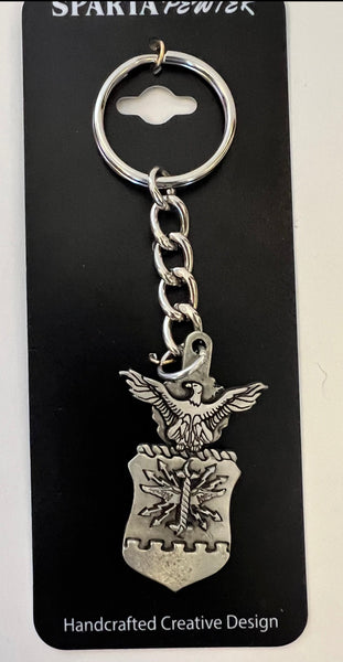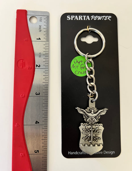 Llavero de peltre con escudo de dos caras de aproximadamente 5" de largo con el escudo del Departamento de la Fuerza Aérea. Detalle clásico de peltre de la aeronave. Anilla tradicional para llavero para sujetar de forma segura a cualquier llave, cartera, bolso, etc.