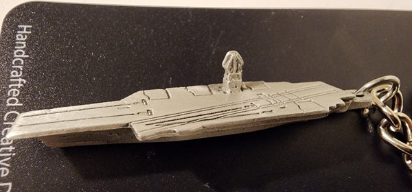 El llavero tridimensional de peltre del portaaviones USS Enterprise (CVN-65), anteriormente CVA-65, mide aproximadamente 4 1/2" de largo. El portaaviones en sí mide aproximadamente 3" de largo.