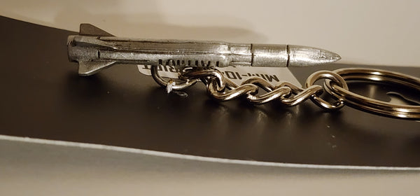 Llavero de peltre con forma de misil Patriot MIM-104 en 3D. Mide aproximadamente 3 pulgadas de largo (incluido el llavero y la cadena). El misil solo mide 2 1/4 pulgadas de ancho de arriba a abajo y 1/2 pulgada de largo desde el lazo para colgar.