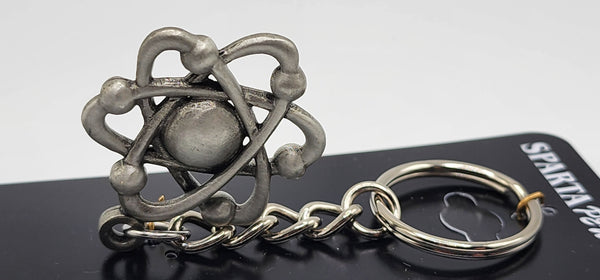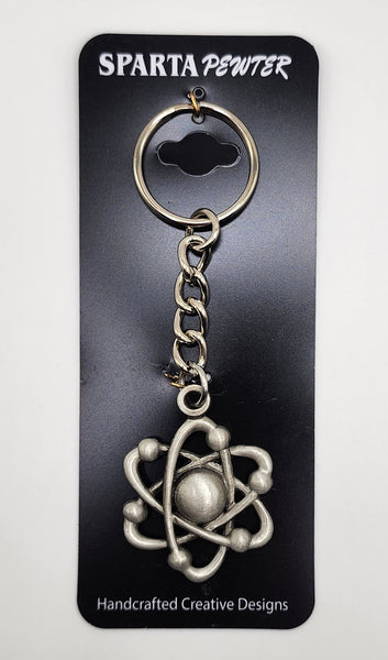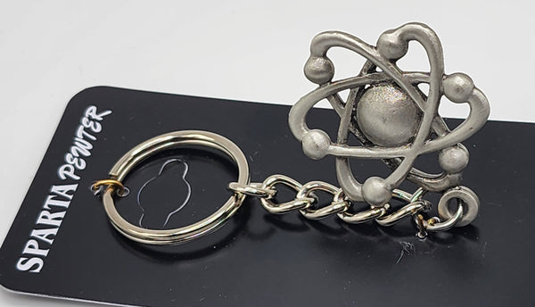 Atom pewter keychain. Measures about 4 1/2 inches long (including keyring and chain). The atomic atom measures approximately 1 1/2 inches wide by 1 3/4 inch tall. Double sided.