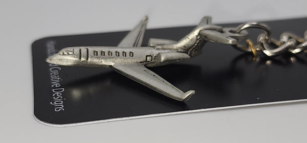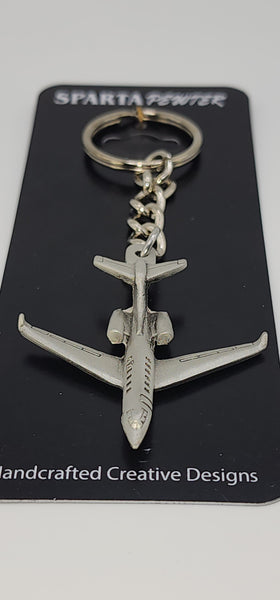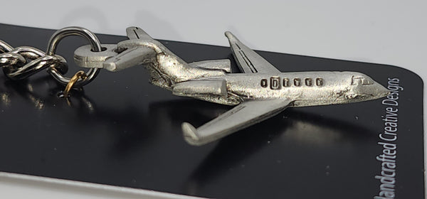 Bombardier Challenger 300 Jet Aircraft Pewter keychain. Measures 4 1/2 inches long. (includes keyring and chain length) Jet itself measures approximately 2 inches in length and  2 inches wide