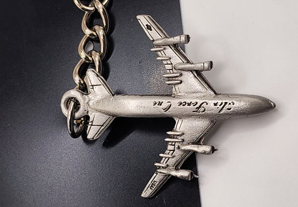 US Air Force One Jet Airplane pewter keychain. Measures about 4 1/2 inches long (including keyring and chain). Plane measures approximately 2 inches wide by 2 1/4 inch tall.