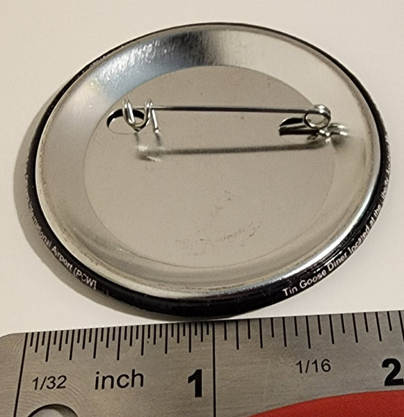 Este prendedor redondo de estilo clásico presenta el logotipo de las alas de Tin Goose Diner con el Ford Tri-Motor. El prendedor mide 2" de diámetro.