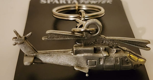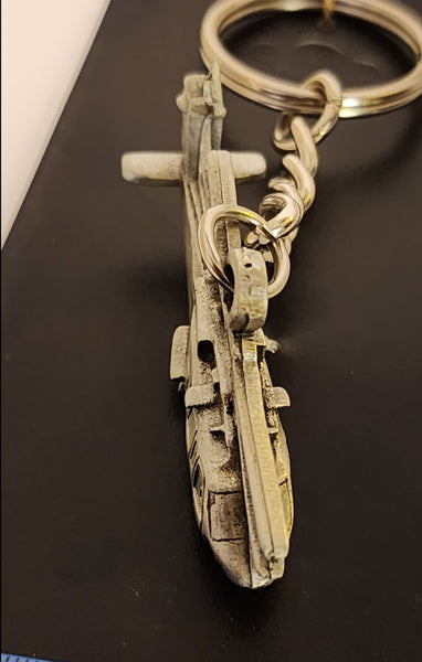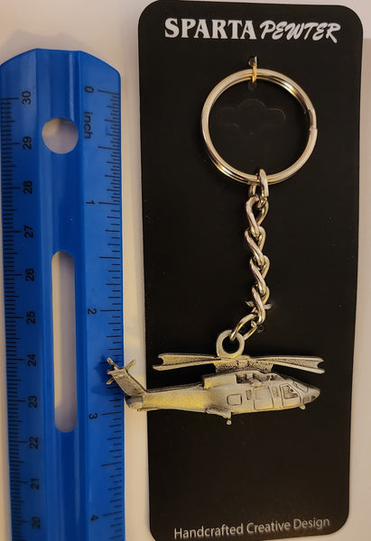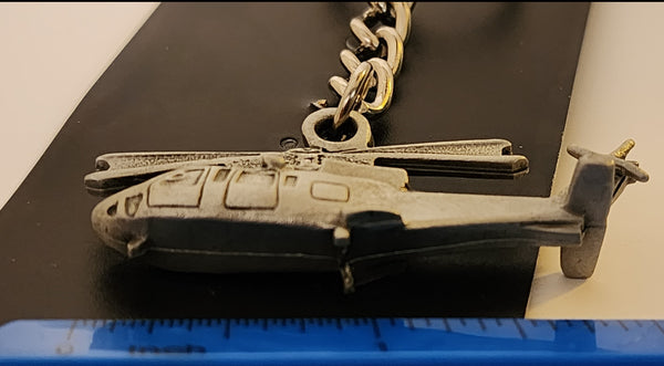 Llavero de peltre con forma de helicóptero Sikorsky S-76. Mide aproximadamente 3 1/4 pulgadas de largo (incluido el llavero y la cadena). Mide aproximadamente 2 pulgadas de ancho.