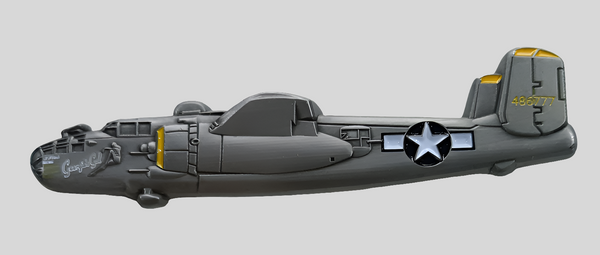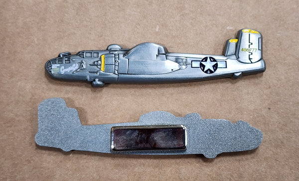 B-25 "Georgie's Gal" Airplane Cutout Magnet!  The magnet arrives packaged in a plastic sleeve.  2 sided!  Measures approximately 3 1/2 inches long and about 3/4 inches tall.  Liberty Aviation Museum exclusive!!