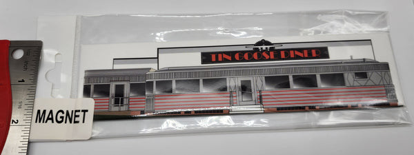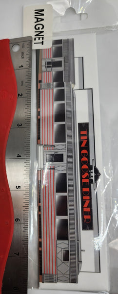 Dale un toque de nostalgia a tu refrigerador, caja de herramientas, estuche de maquillaje, etc. favoritos con el imán rectangular con dibujo de edificio de Tin Goose Diner. Este imán mide 20 cm de largo por 5 cm de alto.