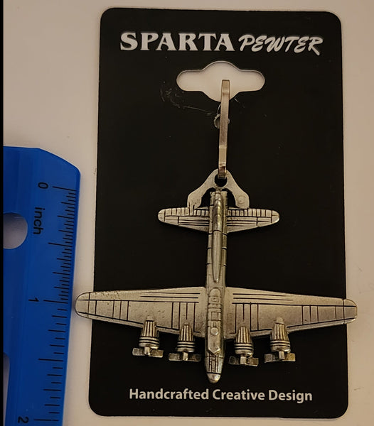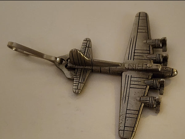 Tirador de cremallera o bolso grande de peltre con forma de Boeing B-17 Flying Fortress. Mide aproximadamente 2 3/4 pulgadas de largo (incluye clip para llaves) y 2 pulgadas 1/4 pulgadas de ancho (envergadura) y 1 3/4 pulgadas de largo (avión de peltre)