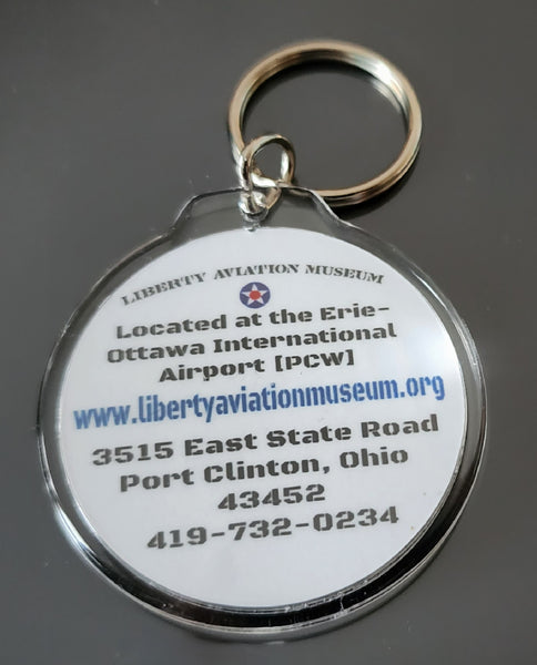 Llavero acrílico con imagen de lunares rojos y blancos de Rosie the Riveter de 2" de diámetro y logotipo blanco redondo de LAM, con un anillo de llavero tradicional para sujetarlo de forma segura a cualquier llave, cartera, bolso, etc. Doble cara con imagen de lunares rojos y blancos de We Can Do It Rosie the Riveter y el logotipo del Liberty Aviation Museum en un lado y la dirección y ubicación del Liberty Aviation Museum en el otro. Mide 3" pulgadas incluido el llavero.